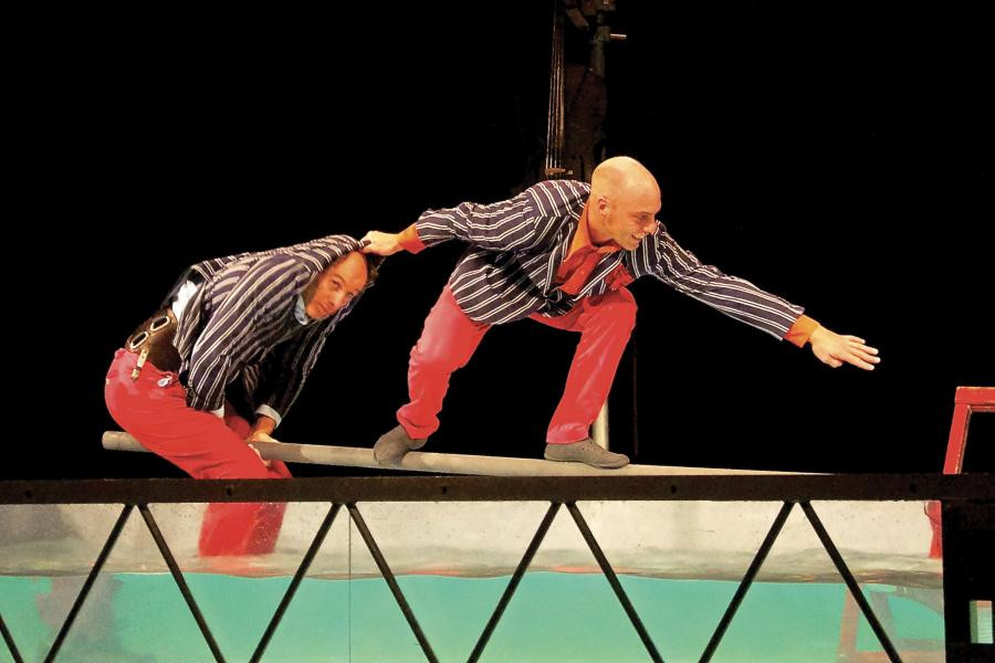 Deux musiciens viennent donner leur concert dans un kiosque à musique… dans lequel il y a de l’eau ! Trente centimètres, presque rien, et pourtant… Le violoncelliste, un peu tête en l’air, ne la voit pas et fait comme si de rien n’était. Le guitariste, à l’inverse, ne supporte pas d’être mouillé et cherche comment éviter tout contact avec l’eau. De cette situation inhabituelle et clownesque naît le cirque : se hisser, se porter, protéger les instruments vaille que vaille…