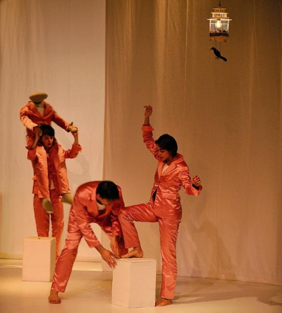 | "Danse facétieuse pour trois interprètes et un ours... Sur une piste semi-circulaire toute blanche, un trio dansant vêtu de costumes roses enchaîne des numéros cocasses et extravagants, comme au cirque. Les scènes se suivent et se ressemblent (presque) ! À chaque fois, c’est un petit détail qui change tout.