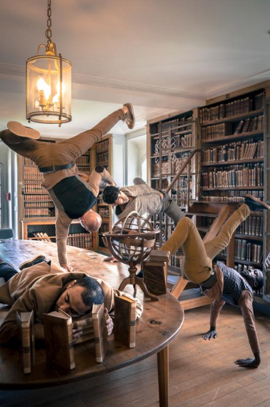 “ Envolées livresques Quatre danseurs hip-hop voyagent dans un univers baroque : un vocabulaire du mouvement du XXIe dans une ambiance XVIIe, un vieux phonographe diffusant des sons électro ou un fauteuil animé dont on ne sait plus qui de lui ou du danseur manipule l’autre...